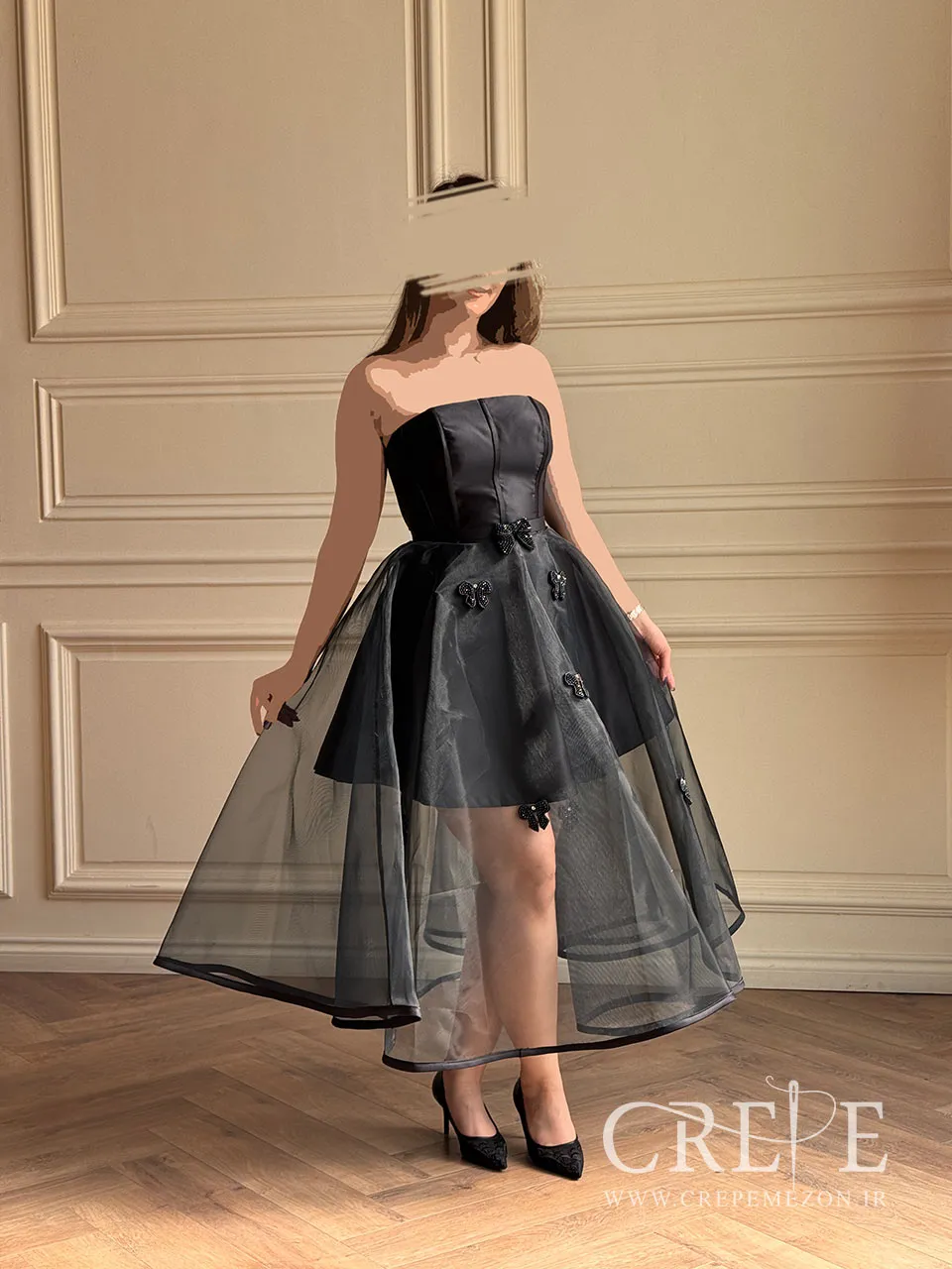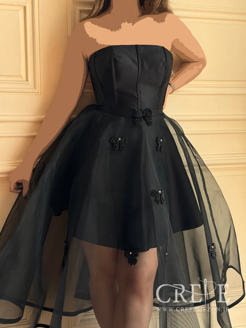 یعنی چند لایه و با جزئیات دوخت دقیق که به آن استحکام و ظرافت خاصی میبخشد. دامن این پیراهن کوتاه و عروسکی است و از جنس ساتن آمریکایی دوخته شده است که درخشندگی و لطافت خاصی دارد. این جنس به خوبی حالت ایستایی و شکلگیری دامن را حفظ میکند و ظاهری شیک و مجلل ایجاد مینماید. در قسمت کمر، یک دامن الحاقی دیگر وجود دارد که از تور آهار دار می باشد. این تور در رنگ کرم است و با پروانه های نگین دوزی شده تزئین شده است، که ظرافت و جذابیت خاصی به طراحی این پیراهن دکلته دامن توری میبخشد.