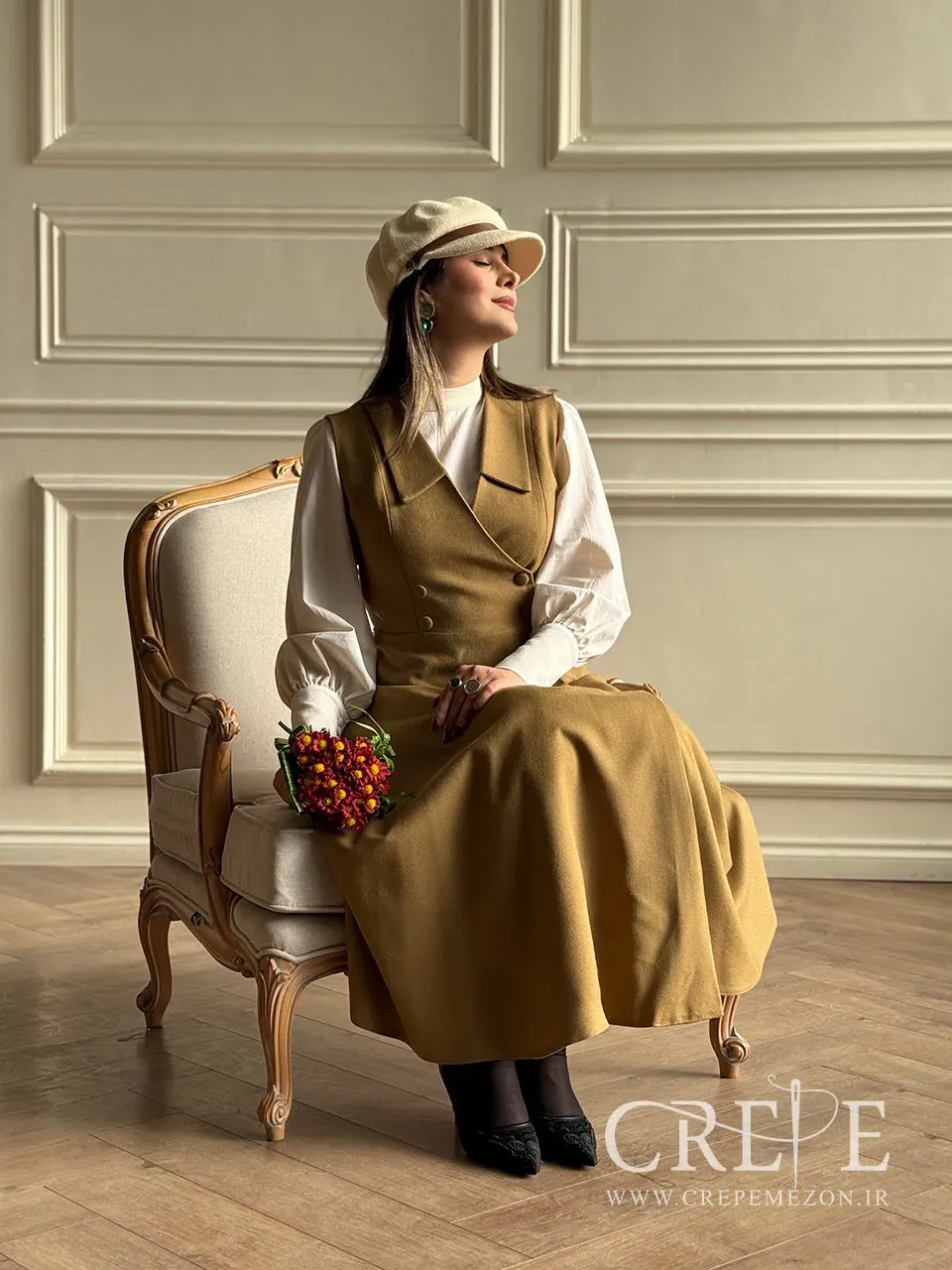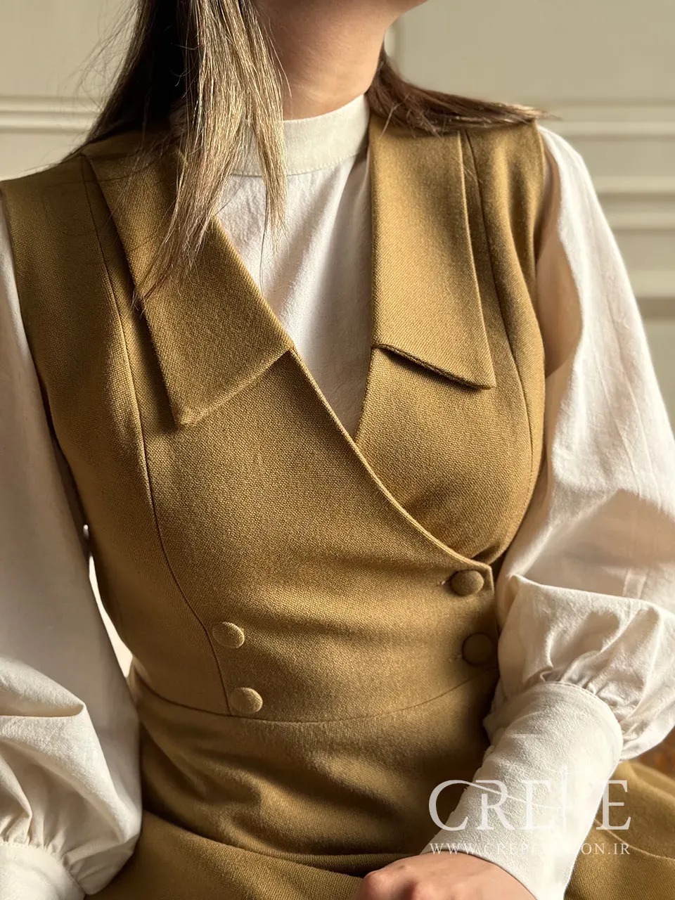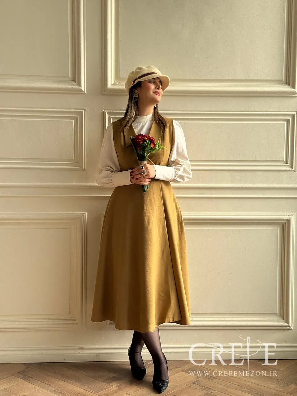 یقه این پیراهن پاییزه به صورت آمریکایی طراحی شده است و با چند دکمه تزئینی، جنبه کاربردی و زیبایی به آن میبخشد. این یقه به راحتی پوشیدن و درآوردن سارافون کمک میکند و همچنین به استایل شما جلوهای خاص میبخشد. قسمت بالاتنه سارافون به صورت اندامی طراحی شده است که به شما ظاهری متناسب و شیک میدهد. این طراحی باعث میشود که فرم بدن شما به خوبی نمایان شود و جذابیت بیشتری به استایل شما ببخشد. از قسمت کمر به پایین، سارافون به صورت کلوشی طراحی شده است که به شما آزادی حرکت بیشتری میدهد و به استایل شما ظاهری زنانه و زیبا میبخشد.