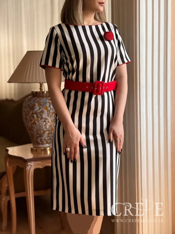 - پیراهن میدی راه راه از جنس کرپ اعلا بوده که با کمربند سیلوئت زیبا و خیره کننده ای از شما به نمایش می گذارد. این لباس مجلسی خرید اقساطی حضوری و آنلاین دارد.