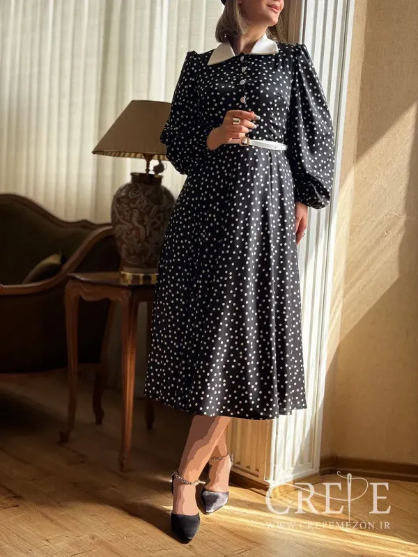 پیراهن خال دار ساتن یک پیراهن بهاری خنک و سبک از جنس ساتن به همراه تور که باعث ایست زیبای دامن در تن می شود. آستین ها کش دوزی شده و یقه از جنس کرپ می باشد.