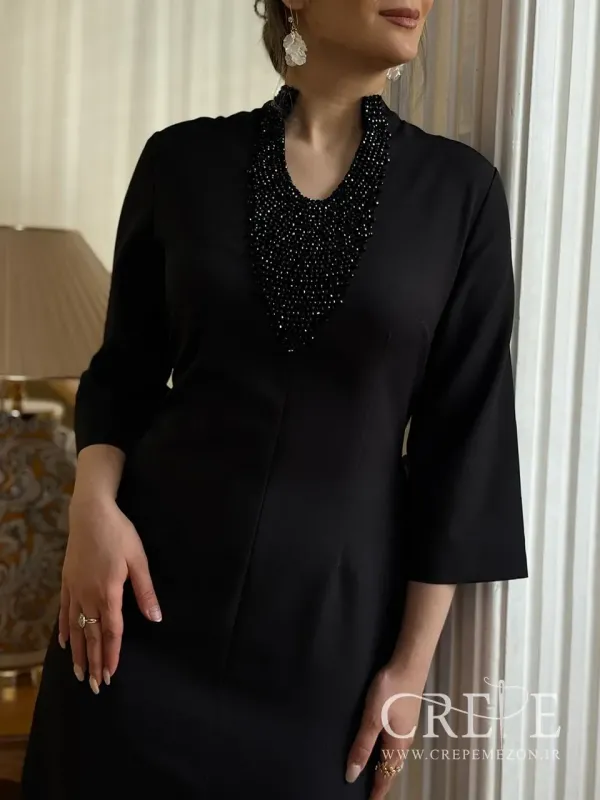 پیراهن میدی یقه سنگدوزی یک لباس مجلسی ساده و شیک است که با طراحی ساده و همیشگی که دارد هیچ وقت از دایره مد خارج نشده و در مراسم شاد یا سوگواری میتوان پوشید.