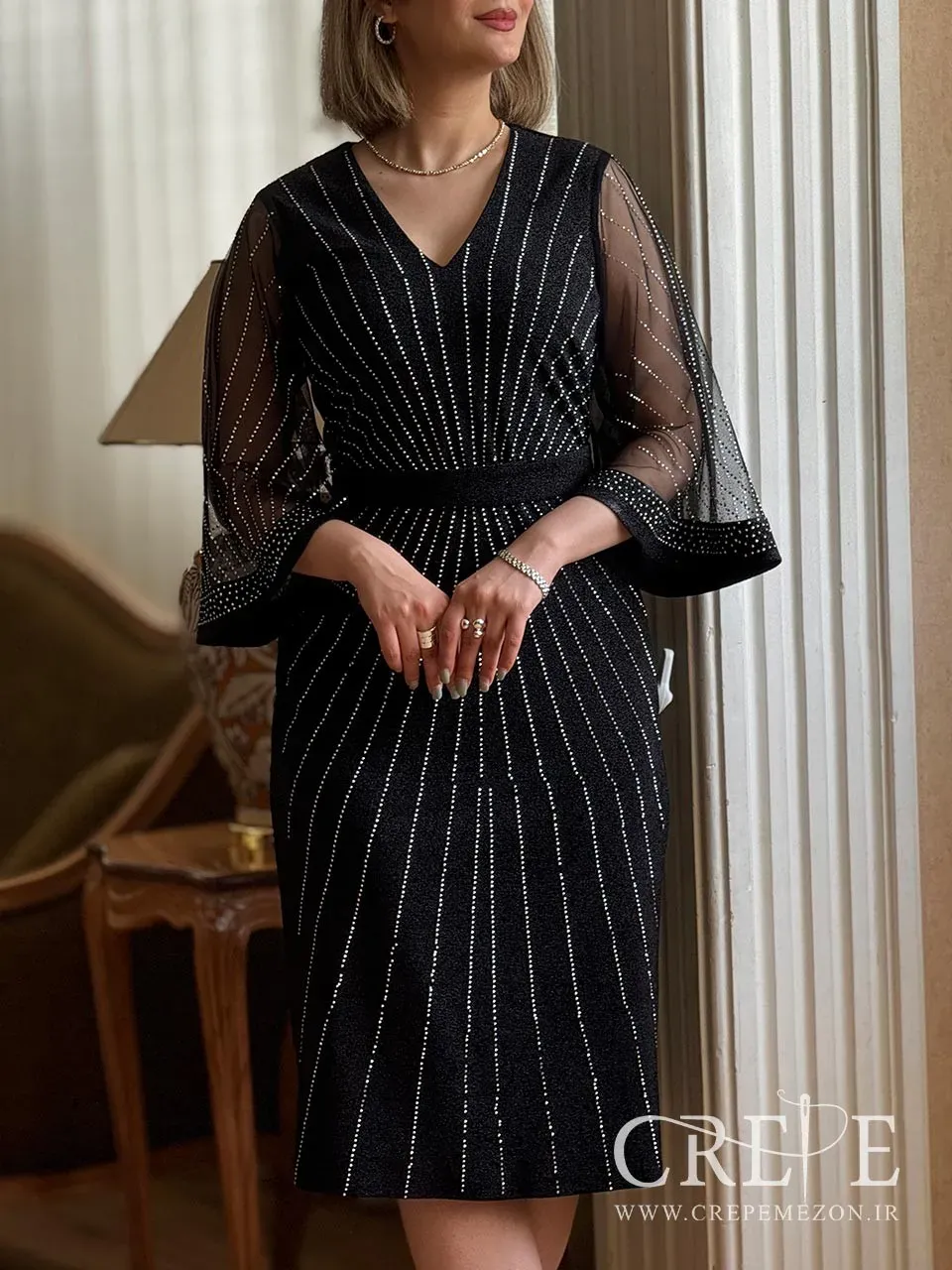 - فرم ساعت شنی : یقه V همراه با خطوط عمودی براق بر زیبایی انحنای بدن تاکید کرده و آن را برجستهتر نشان میدهد.