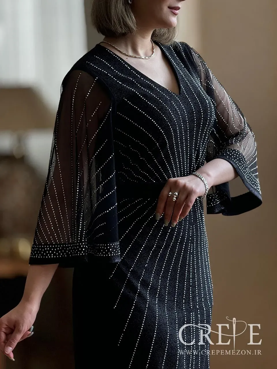 2. آستینها : آستینهای این لباس بلند و از جنس تور هستند که با دوخت دانههای براق (کریستال) تزئین شدهاند، این ویژگی جلوهای زنانه و لطیف ایجاد میکند.