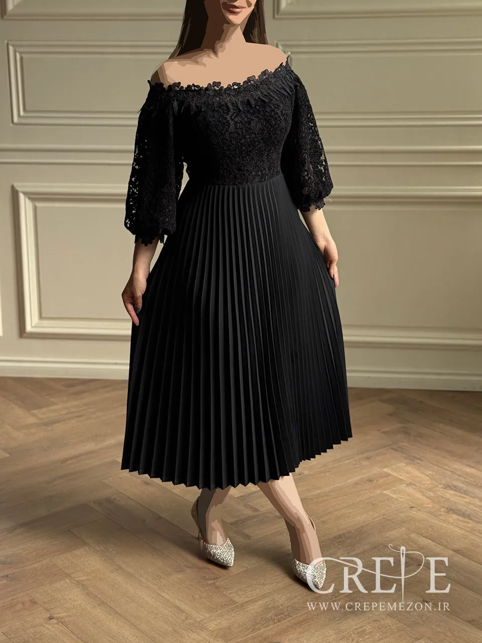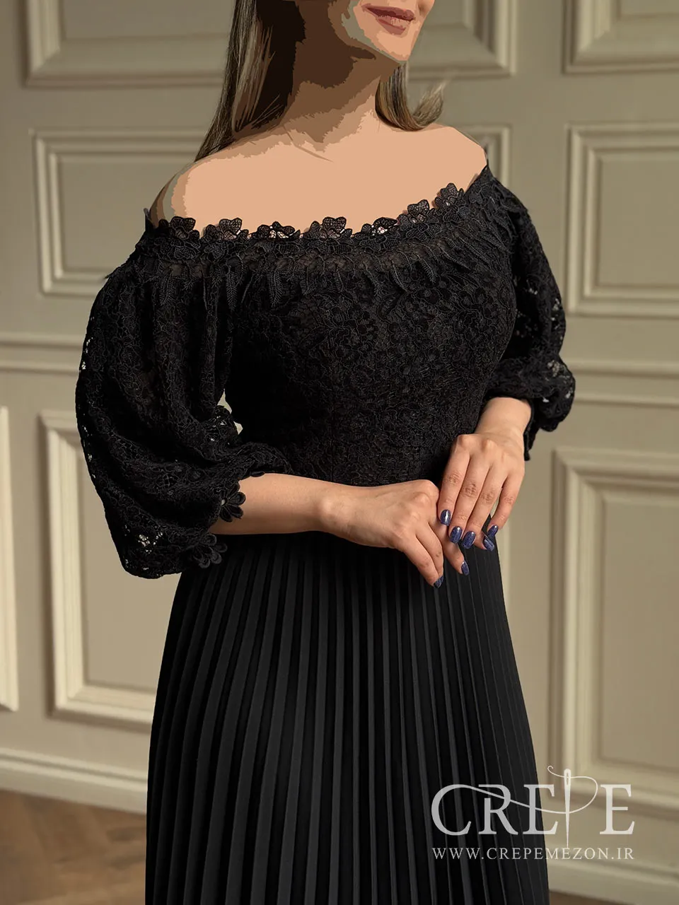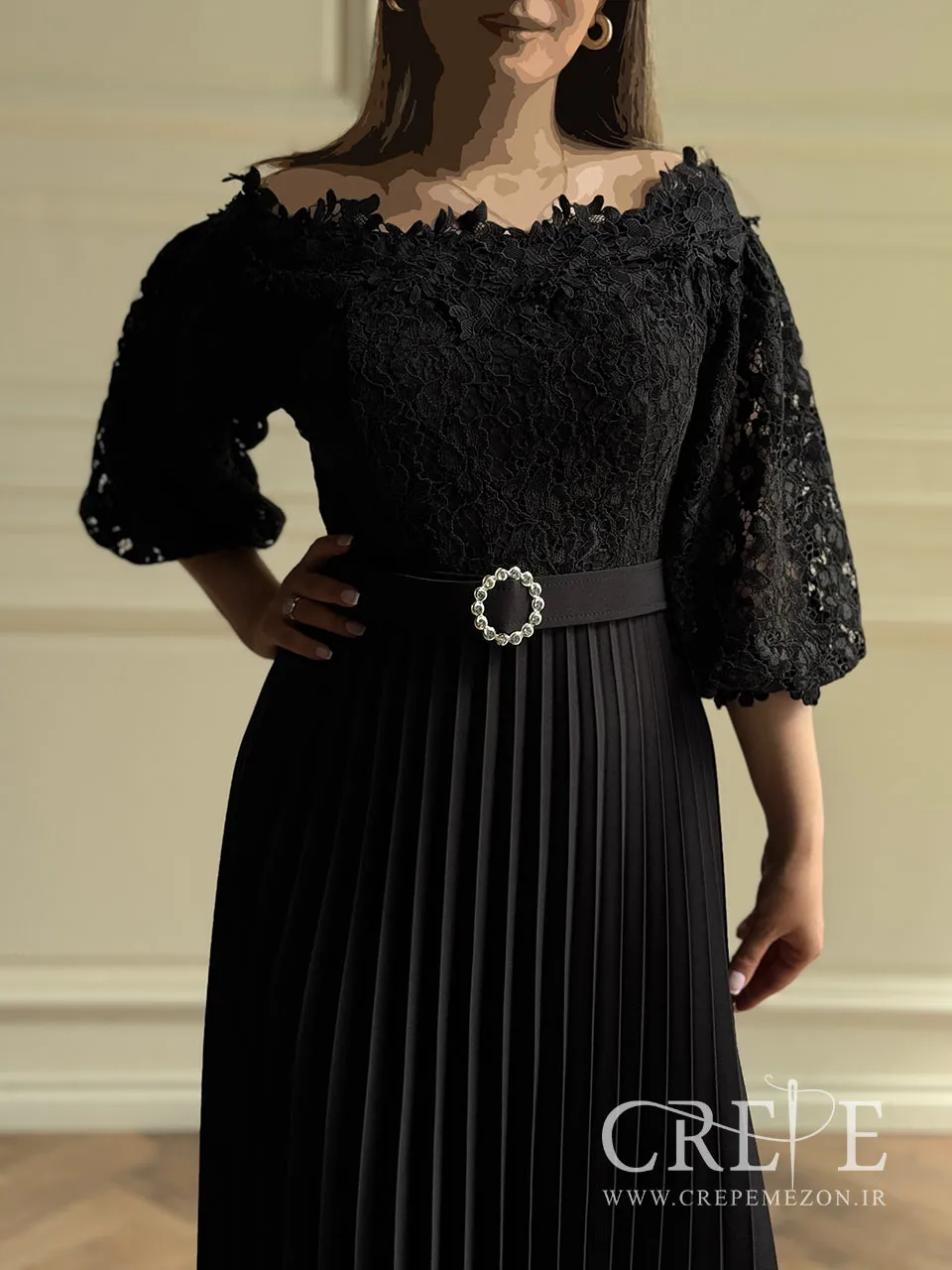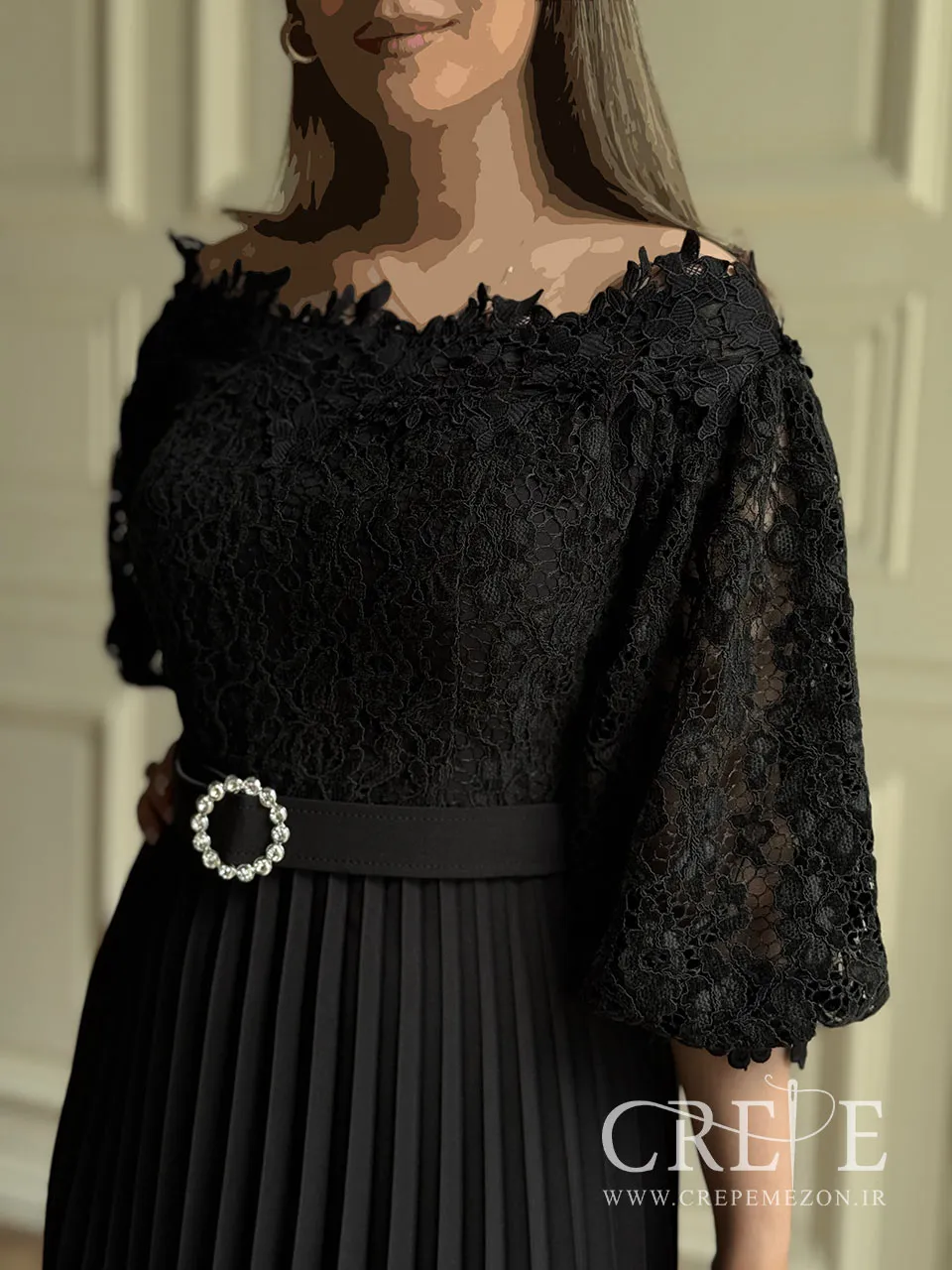 یقه این پیراهن مجلسی گرد بوده و لبههای آن با دقت زیادی طراحی شدهاند، تا زیبایی این لباس مجلسی را بیشتر کنند. در قسمت کمر، یک کمربند پهن از همان جنس پارچه اصلی وجود دارد که توسط یک سگک بزرگ تزئینی بسته میشود. این سگک نه تنها وظیفه جمع کردن کمر را دارد بلکه خود نیز به عنوان یک اکسسوری جذاب عمل کرده و جذابیت بیشتری به لباس اضافه میکند. دامن این پیراهن مجلسی پلیسه دار است؛ یعنی با چینهای منظم دوخته شده که حجم بیشتری ایجاد کرده و ظاهر شیکی به لباس داده است. طول دامن تا مچ پا بوده که مناسب برای موقعیتها رسمیتر مانند مهمانیها یا جشنهاست. در مجموع، ترکیب پارچهی دانتل در بالاتنه، طراحی پلیسهای دامن، و کمربند تزئینی باعث شدهاند تا این پیراهن انتخاب بسیار مناسبی برای خانمهایی باشد که دنبال لباسی شیک، کلاسیک و در عین حال راحت هستند.