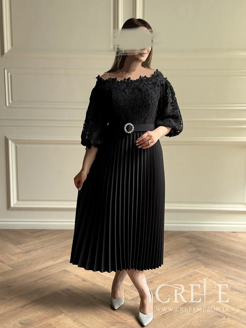 پیراهن دانتل پلیسه کمردار یک لباس مجلسی شیک و چشمگیر که از ترکیب پارچه دانتل و کرپ گرم بالا دوخته شده است. همانطور که در تصاویر میبینید این لباس مجلسی شیک در سایزبندی 40 تا 46 و رنگبندی مشکی، سبز و کرم موجود است که دارای طراحی زیبا و شیک می باشد. پارچه آن جنس لطیفی دارد که به خوبی با بدن سازگار است. بالاتنه این لباس از جنس دانتل دوخته شده که جلوهای خاص و کلاسیک به لباس میبخشد. این بخش دارای آستینهای سه ربع با برشهای آزاد و گشاد است که حس راحتی را افزایش میدهد. همچنین برای پف و ایست بهتر آستین ها از تور نیز استفاده شده است. بالاتنه این لباس مجلسی نیز با آستر کاور شده است، همانطور که دامن نیز دارای آستر کوتاهی می باشد. ریز جزییات و تمیزی دوخت و مرغوبیت پارچه از سری عواملی است که این پیراهن دانتل پلیسه کمردار به انتخاب شیکی تبدیل شده است.