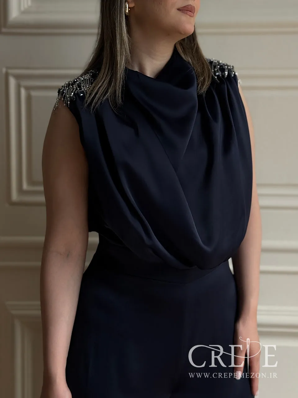 این سرهمی مجلسی، با شلوار واید و طراحی اندامی در کمر، استایلی مدرن و جذاب ایجاد میکند.