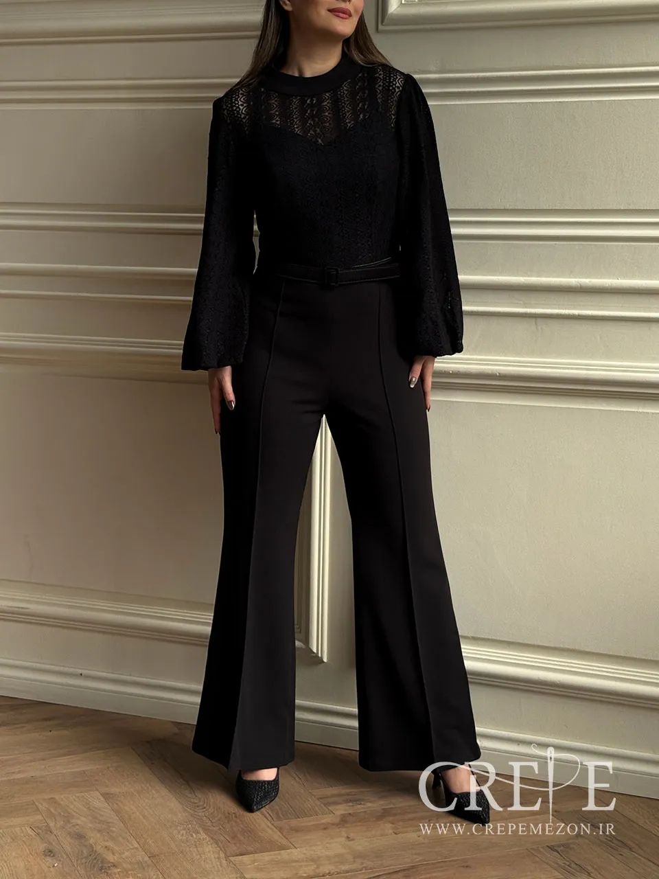 آستینها به صورت پفی و مچی طراحی شدهاند که به این سرهمی مجلسی ظاهری مدرن و جذاب میبخشند. طراحی پفی آستینها به زیبایی و ظرافت لباس افزوده و میتواند فرم بازوها را به خوبی نمایش دهد. بالاتنه این اورال دارای آستر توری است که به آن راحتی و زیبایی بیشتری میبخشد. این آستر میتواند به جلوگیری از نمایان شدن بدن کمک کند و در عین حال حس راحتی را برای کاربر ایجاد کند. شلوار به صورت بوتکات طراحی شده است. این نوع طراحی به شما این امکان را میدهد که با انواع کفشها (مانند بوتها یا کفشهای پاشنهدار) آن را ست کنید. شلوار بوتکات به خوبی فرم پاها را نمایش میدهد و به استایل شما زیبایی بیشتری میبخشد.