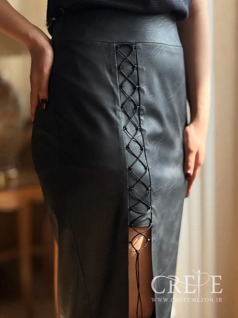 دامن چرم بندی یک دامن مجلسی که در سایزبندی 46-38 و رنگ مشکی موجود شده است. همچنین با طراحی اندامی و بندینک های زیبا یک دامن شیک برای استایل های مدرن است.