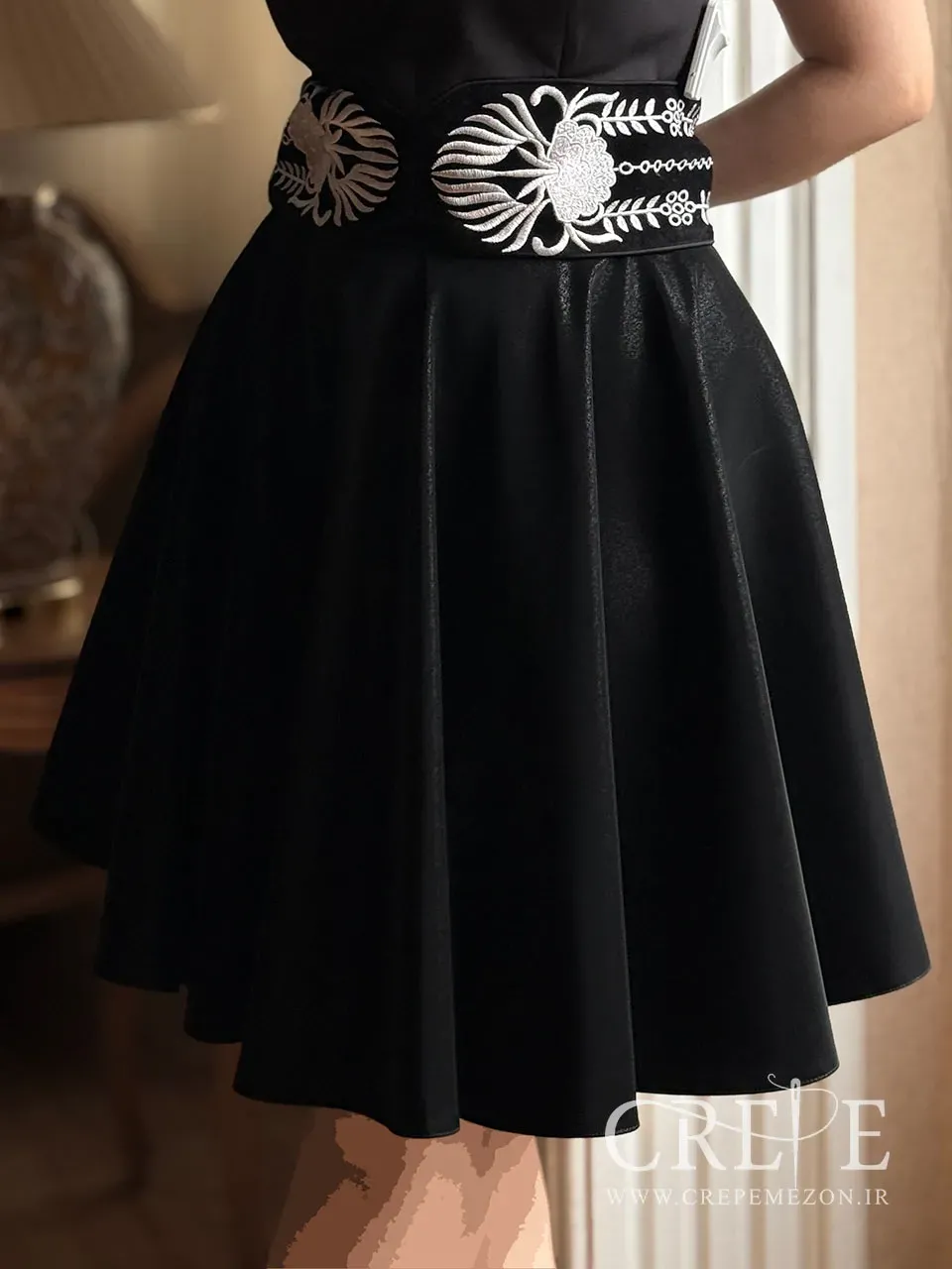 دامن تمام کلوش یک دامن مجلسی شیک و زیبا که به صورت کامل و یکدست از بالا تا پایین دارای برش کلوش یا پرچین است، به این معنا که در قسمت پایین گشادتر و حجیمتر میشود و ظاهری آزاد و پرجنبوجوش دارد. این نوع دامن برای آن دسته از افرادی مناسب است که میخواهند ظاهری شیک، آزاد و در عین حال مجلسی داشته باشند. این دامن از پارچه طرح چرم ساخته شده است، که ظاهر لوکس و مدرنی به آن میدهد. طرح چرم معمولاً به صورت سطحی براق و بافتی خاص است که حس شیک بودن را منتقل میکند.