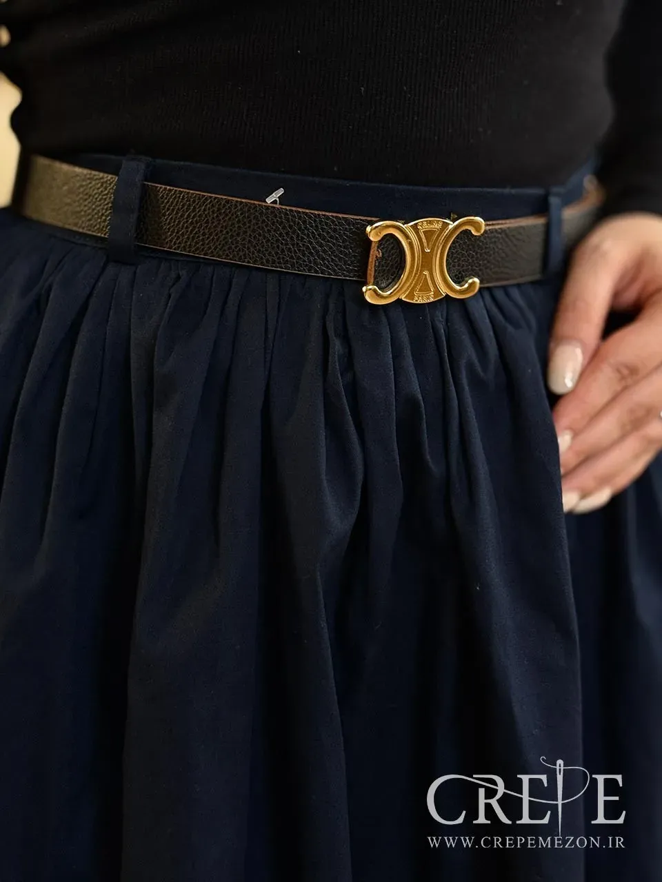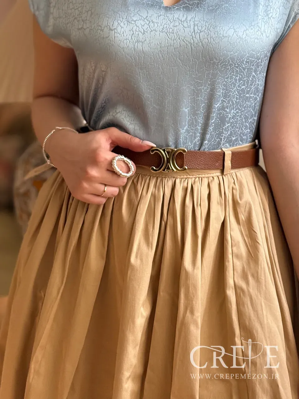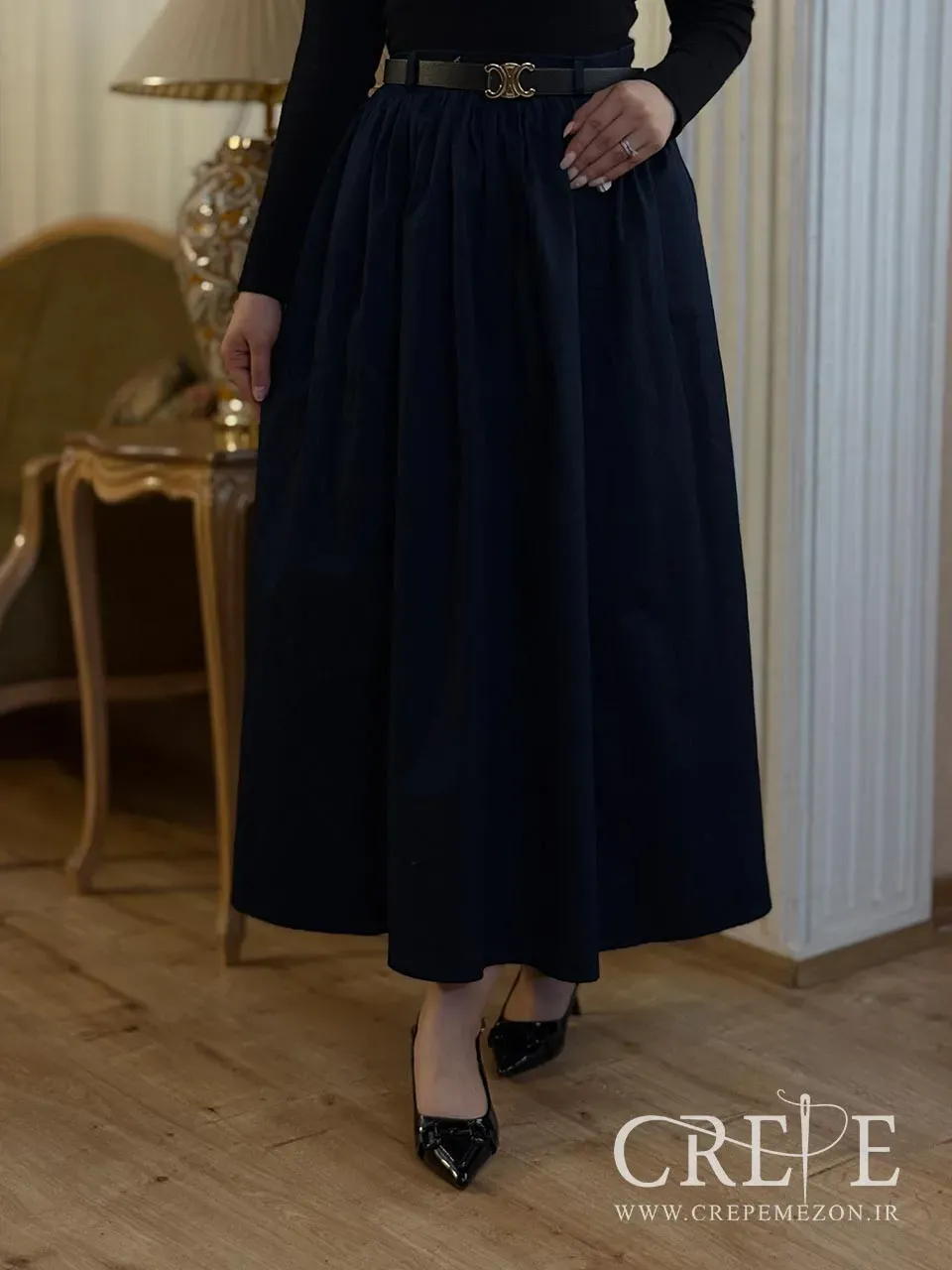 دامن پوپلین کمربنددار یک دامن بلند که از جنس پوپلین بوده و دورکمر آن چین های ریزی دارد که باعث ایستایی پف دار آن می شود. رنگبندی آن مشکی، کرم و سرمه ایست.