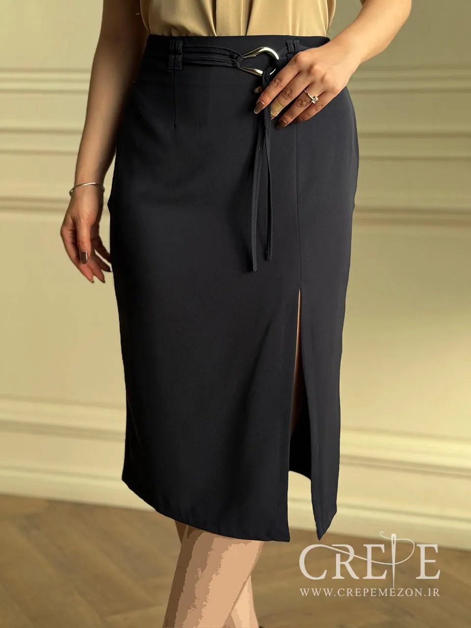 دامن سگک بندی چاکدار یک دامن مجلسی که از جنس کرپ پارکر بوده و در سایزبندی 48-38 موجود شده است. این دامن زیبا با انواع شومیز، تاپ و کت به زیبایی ست می شود.