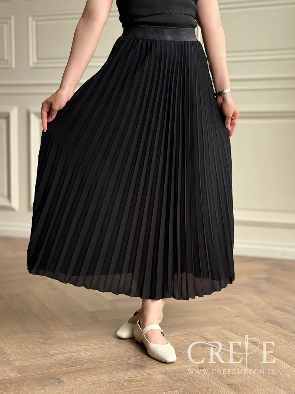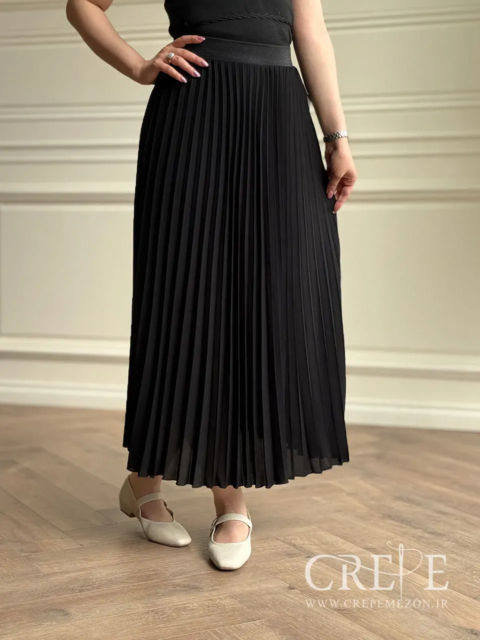 دامن پلیسه کرپ حریر با کمری 5 سانت بهترین انتخاب برای ست با انواع شومیز، نیمتنه و کت های چرم یا جین می باشد. این دامن مجلسی خرید حضوری و آنلاین دارد.