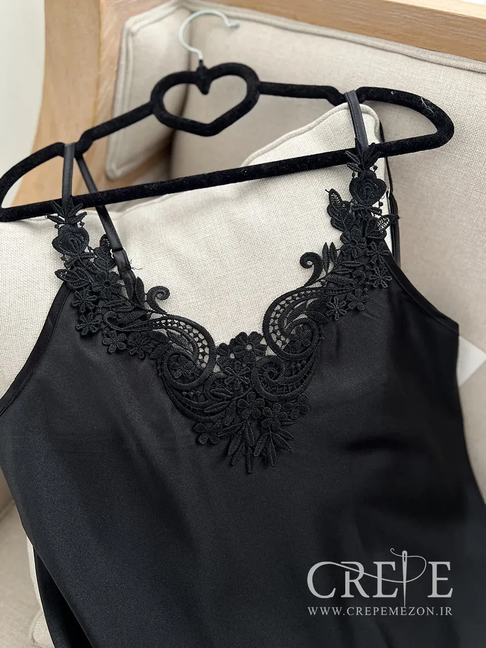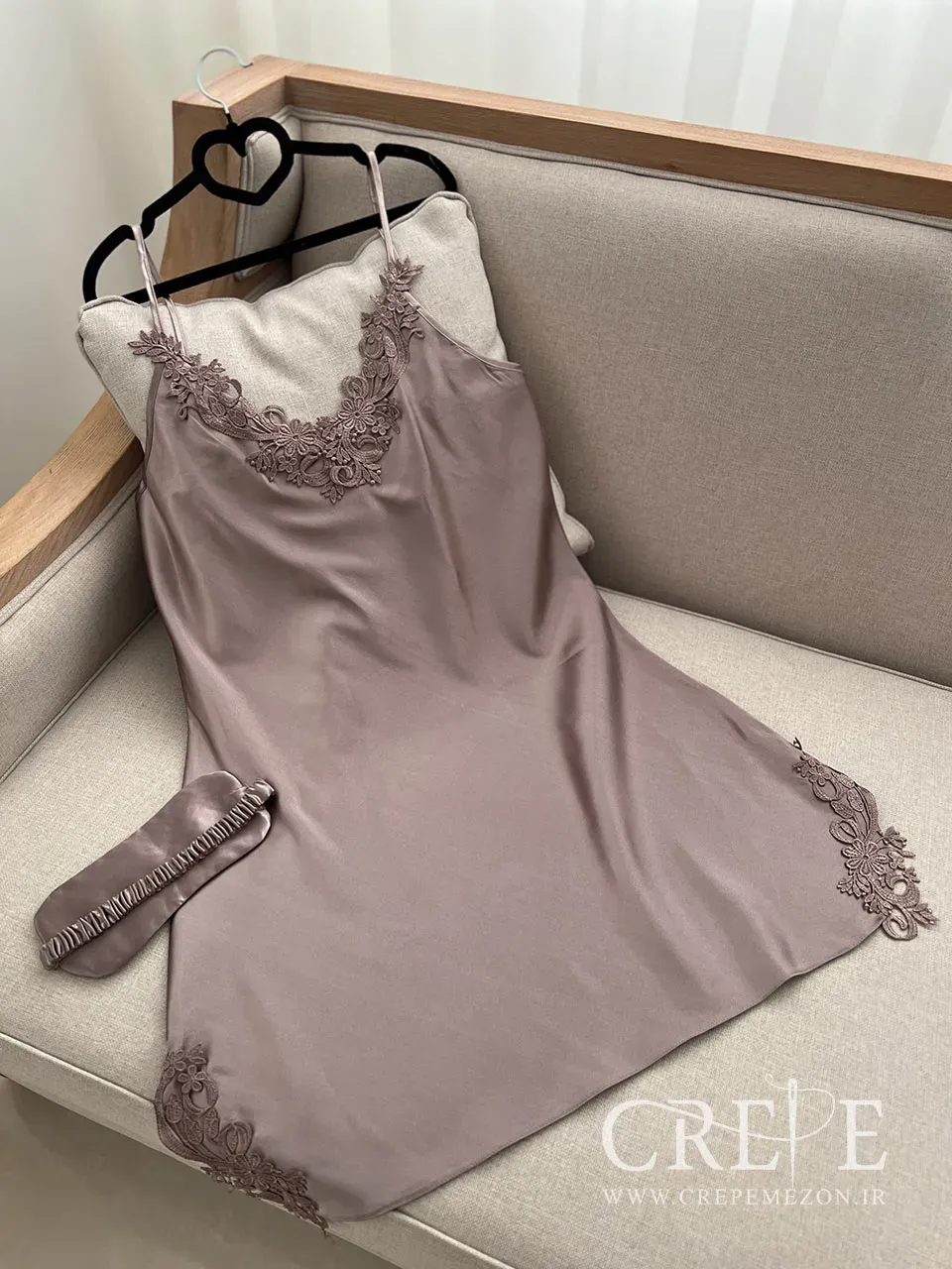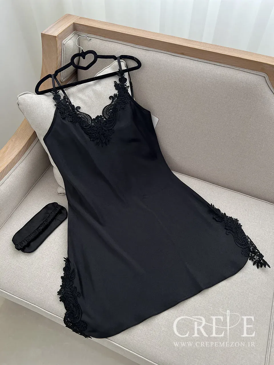 لباس خواب ساتن گیپور به همراه چشم بند یک آیتم کاربردی که راحتی و لطافت بی نظیری هنگام خواب هدیه می دهد. رنگبندی این پیراهن خواب مشکی، سفید و یاسی می باشد.
