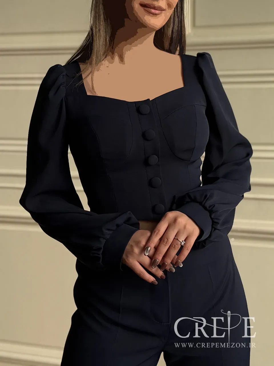 این ست دوتیکه که شامل یک کراپ با دکمههای بزرگ و آستین پفی به همراه شلوار بلند است، میتواند به روشهای مختلفی استایل شود :