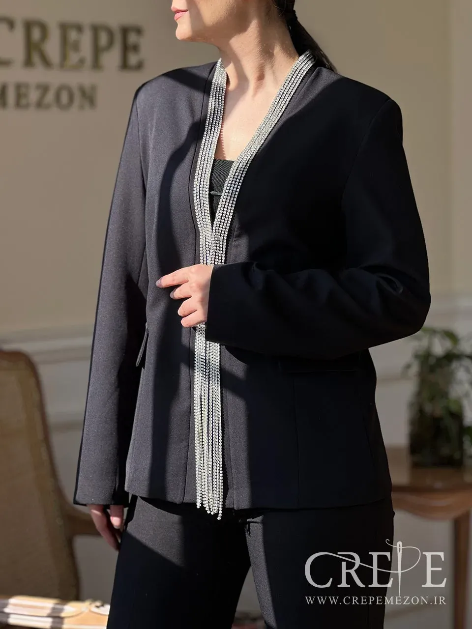 استفاده از آستر مکرون در داخل کت، علاوه بر افزایش راحتی، به حفظ فرم و استحکام کت کمک میکند. این آستر همچنین میتواند به عایق بودن کت در برابر سرما کمک کند. نوارهای نگین دوزی که از قسمت یقه شروع شده و تا پایان کت ادامه دارد، جلوهای لوکس و مجلسی به این ست میبخشد. این جزئیات دقت و ظرافت در طراحی را نشان میدهد و میتواند توجهها را به خود جلب کند. این کت شلوار مجلسی به راحتی با انواع اکسسوریها و کفشها ترکیب میشود. میتوان آن را با یک کیف دستی شیک و کفشهای پاشنه بلند ست کرد تا ظاهری کامل و جذاب ایجاد کند. این ست زنانه مناسب برای مجالس رسمی، مهمانیها و مراسمهای ویژه است و به راحتی میتواند به عنوان یک انتخاب منحصر به فرد در کمد لباس هر خانمی قرار گیرد.