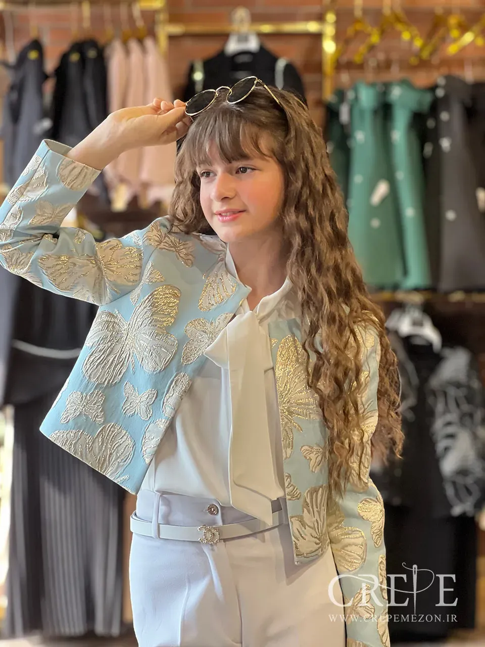 کت ژاکارد پروانه ای یکی از جدید ترین و زیباترین مدل های کت دخترانه است که با طراحی خاص و پارچه ی ژاکارد بافت دار وجلوی جذاب ومتفاوت به استایل فرزند شما می بخشد .این کت با رنگهای شاد ولطیف وطرح های پروانه ای برجسته مناسب برای موقعیت های رسمی بوده و می تواند انتخابی ایده آل برای مهمانی ها باشد .